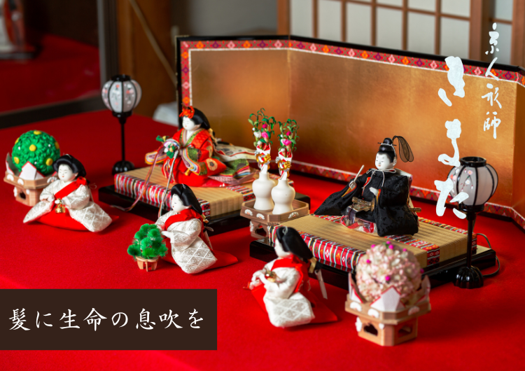 そのなかでも、きまたの髪付は、脇役とはいえ、昔ながらの材料、手法により、おひなさまの引き立て役として、伝統に裏打ちされた確かな専門性と技術力で評価を受けてまいりました。